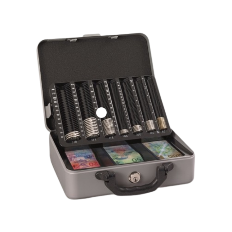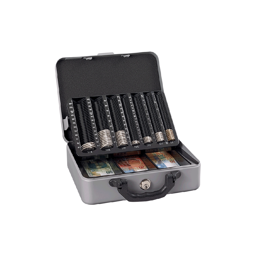 Inneneinrichtung: Herausnehmbarer Münz-Zähleinsatz, 3-teiliges Notenfach im Boden, Moneta-Einzelmünzrillen